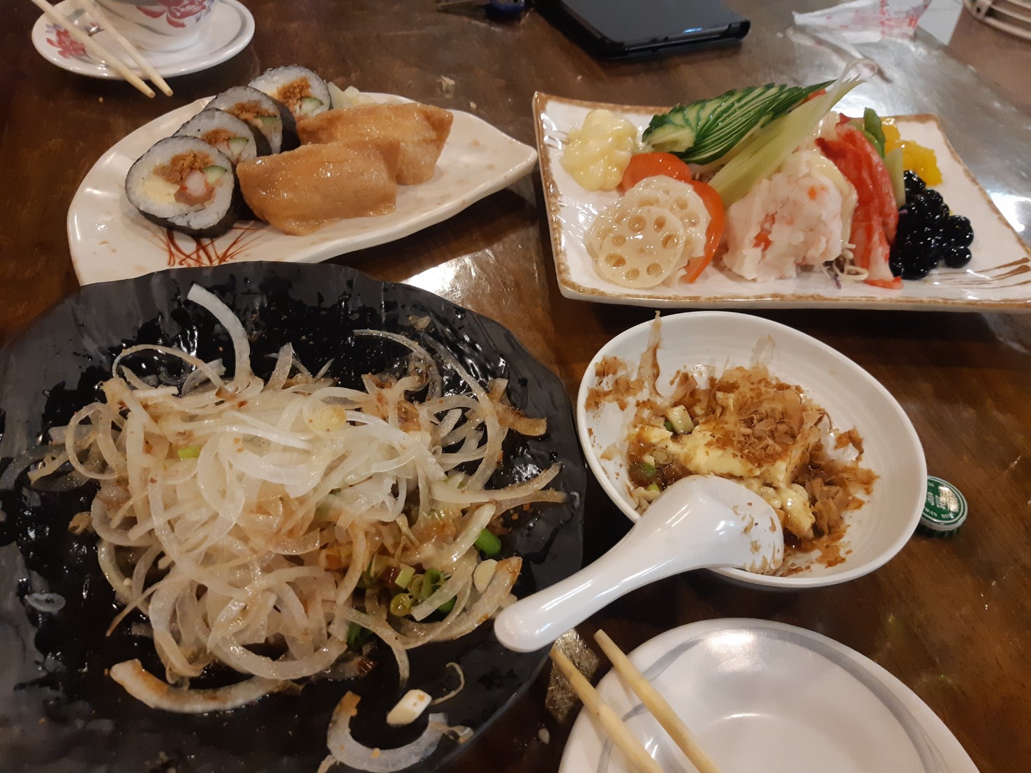 涼拌洋蔥、冷豆腐、綜合沙拉、壽司、烤魚下巴、炸豆乳雞